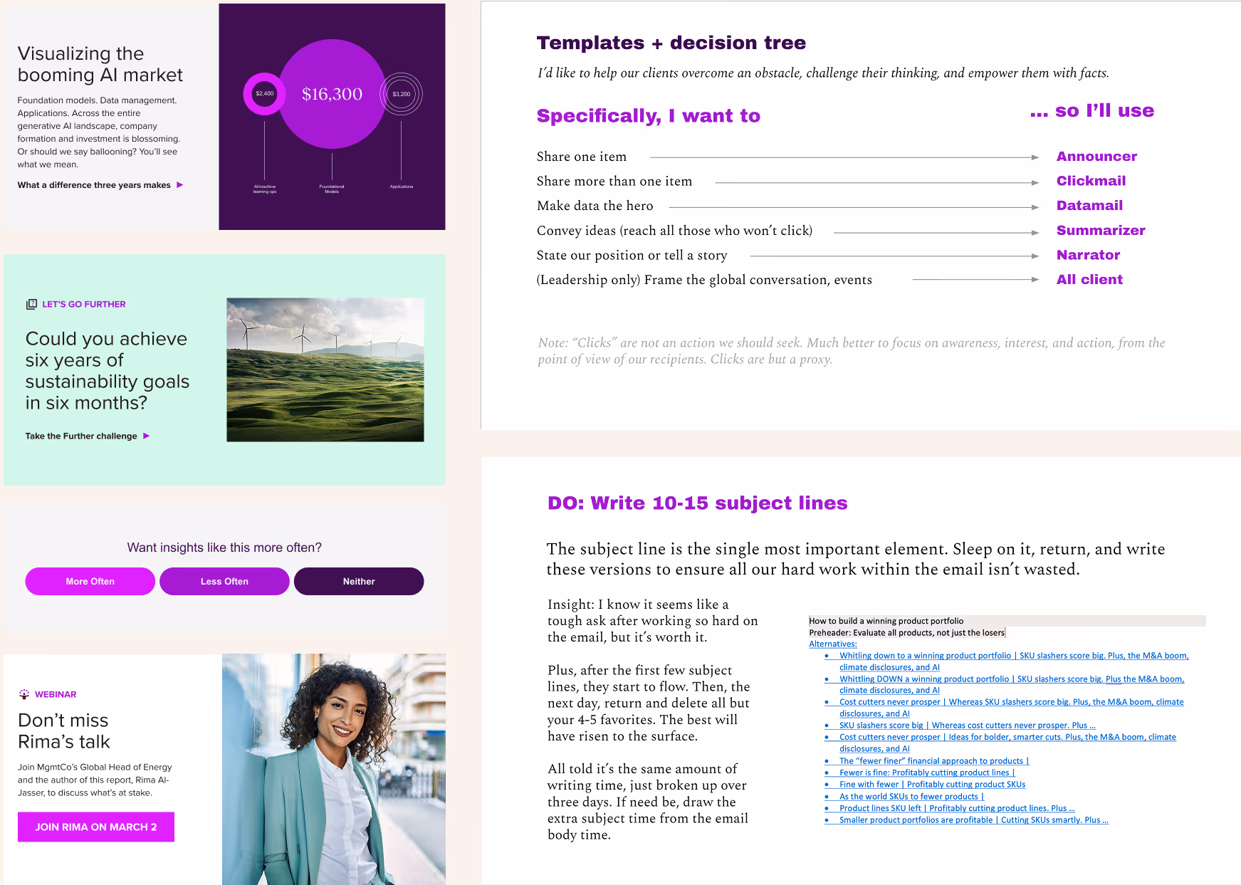 The CMO took it up to the managing partner and steering committee, and that argument won the day. We began writing MgmtCo’s emails in the new, more aggressively opinionated style with clear, crisp insights. We expanded that into a set of emails they could start to implement with very little coding work to test. And test they did. Over months, they pored through every part from the new subject line convention, header, body, and graphics to confirm piece by piece which parts worked, and together, to iterate.