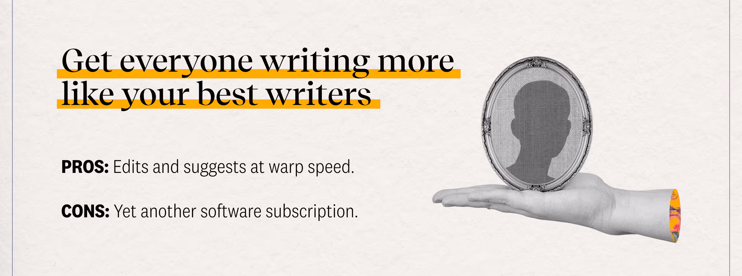 Here’s a good use for when you must generate text with AI: Give a tool like Grammarly (the enterprise version) a truth set of five articles written by your best writer, and prompt it with new information and ask it to write it in the style of those five articles.