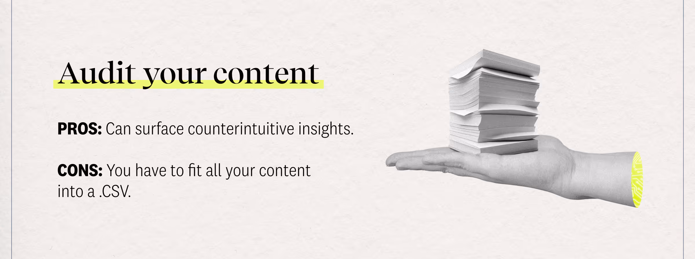 One client of ours spent half a year auditing their 9,000 pieces of content. That individual was so burnt out, they never published the results and resigned shortly after. Few content teams audit their content this exhaustively. Most do not at all. This is a budding use case for AI. We find that the summaries lack insight for obvious reasons (most are simply rephrasing, “Use more customer stories”). Yet they do produce something, which can be better than nothing, and is an area we can imagine them adding far more value once they improve.