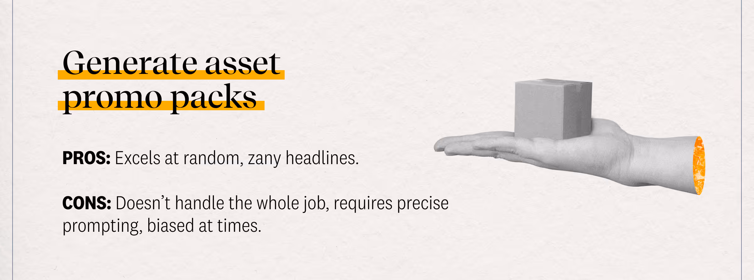 Below are our current uses across demand marketing and content. We’re keeping this mostly tool- agnostic, but your options include GPT-4, Jasper, Grammarly, and Perplexity. And we will return frequently to update these use cases as we learn more—and provide more specific examples.