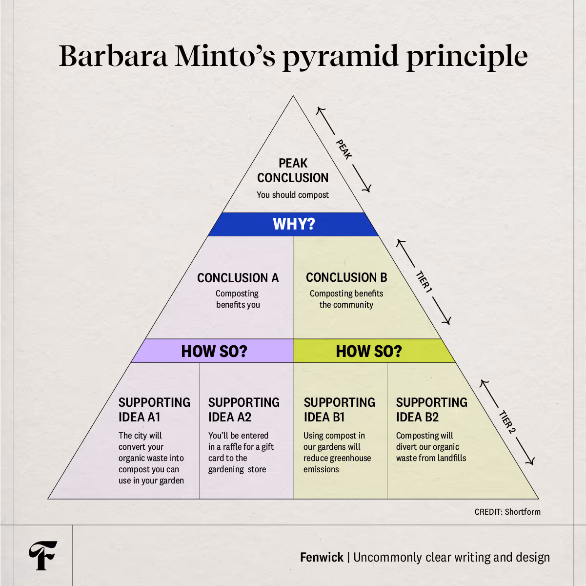 In 1973, a young McKinsey consultant named Barbara Minto had an epiphany: At work, people write backwards. They use the writing to think through things, and arrive at a thesis at the end. But this makes for impenetrable reading. Good writing begins with the thesis.