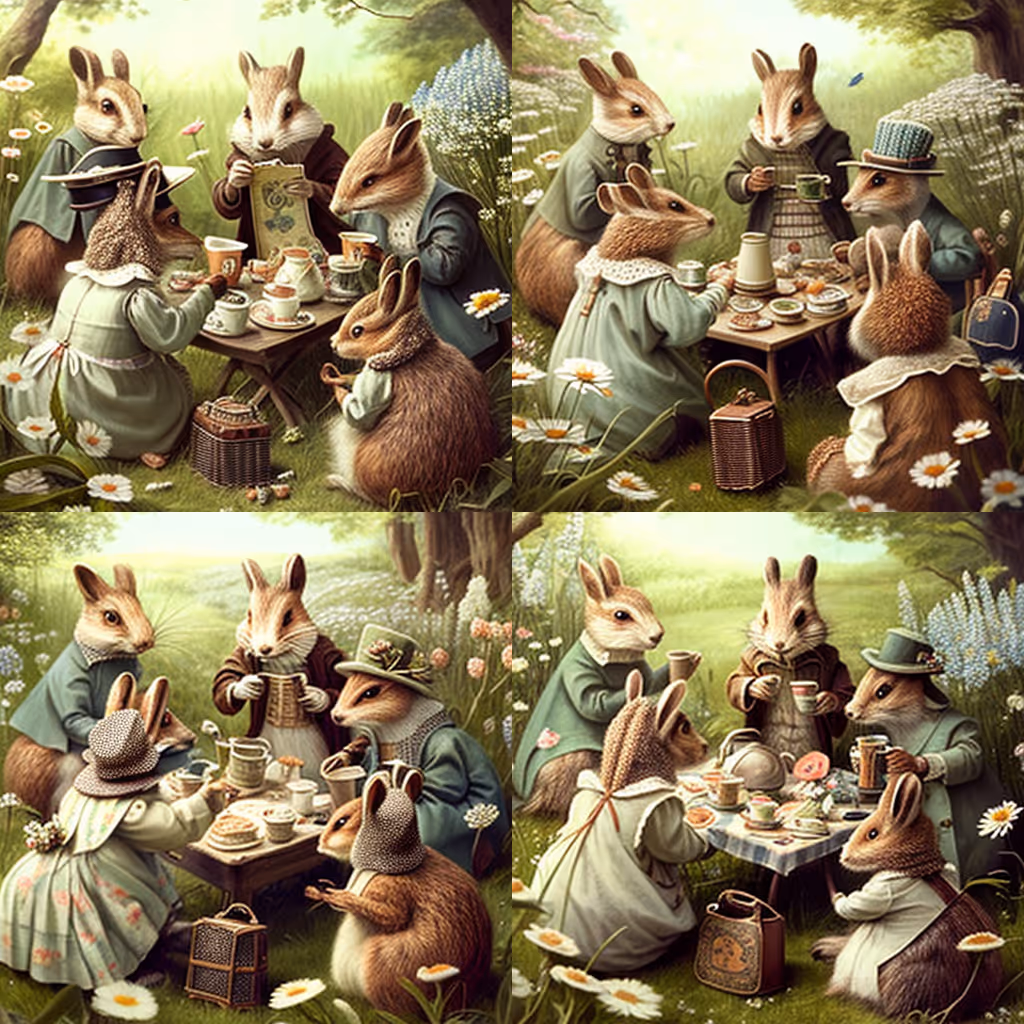 /image [ prompt ] A group of Beatrix Potter-esque woodland creatures (think squirrels, rabbits, foxes, badgers, etc.) having a tea party in a meadow of daisies in the springtime