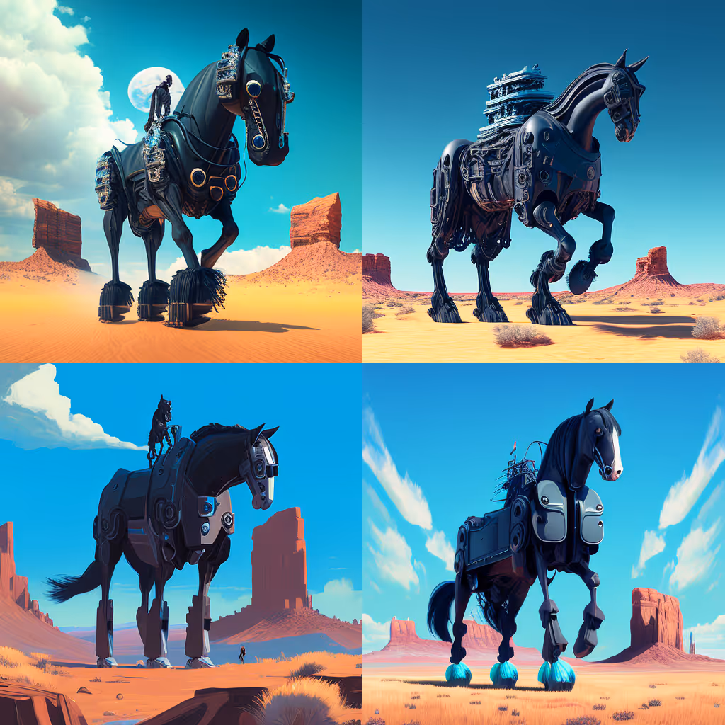 /image [ prompt ] a robot is riding on the back of a black Friesian horse through a Moab-like landscape under a blue sky