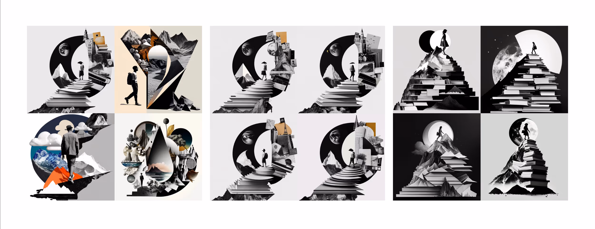 /image [ prompt ] style high-contrast surreal collage with no background. we love the journey toward excellence and all the gems of insight we discover along the way. We prioritize creativity, teach as a way of work life, and practice things, not until we get them right, but until we cannot get them wrong