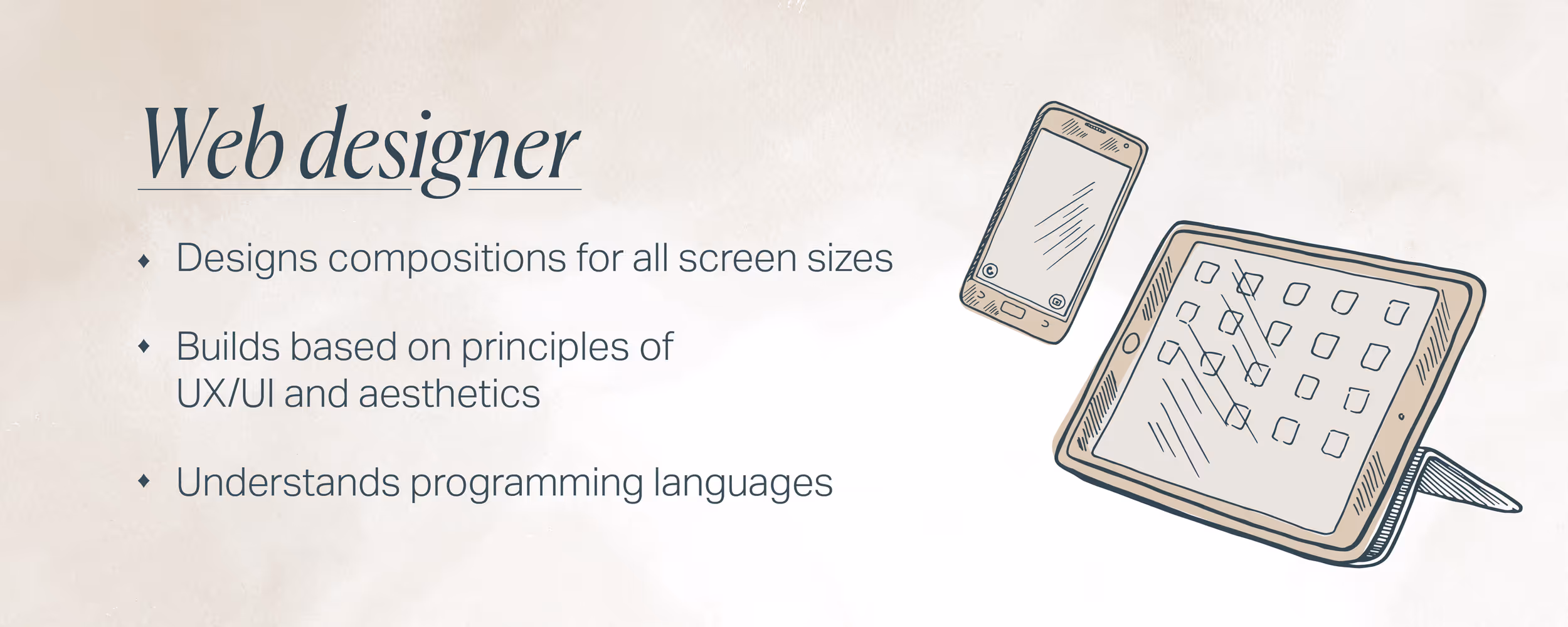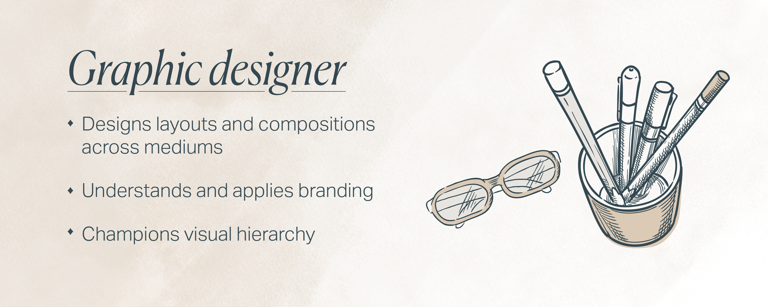 If you involved everyone in the list above, and your project manager stayed on top of things, I’ll bet it turned out great. But of course, reality is messy. And, budgets being what they are, one person can wear multiple hats. A videographer we know also excels at motion graphics. Fenwick’s own design directors are multi-talented in layout, graphics, brand, and illustration. But no one person can do it all. Because there’s no such thing as a designer.