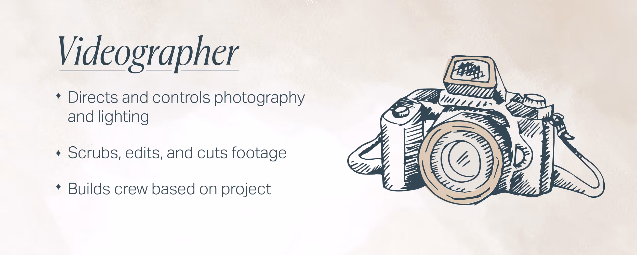 For most marketing videos, a videographer will probably also direct. (If they don’t, the creative director will.) But they too will need help. They’ll have an assistant (or two or three) who act as scouts and set designers to find, book, and decorate the film locations.