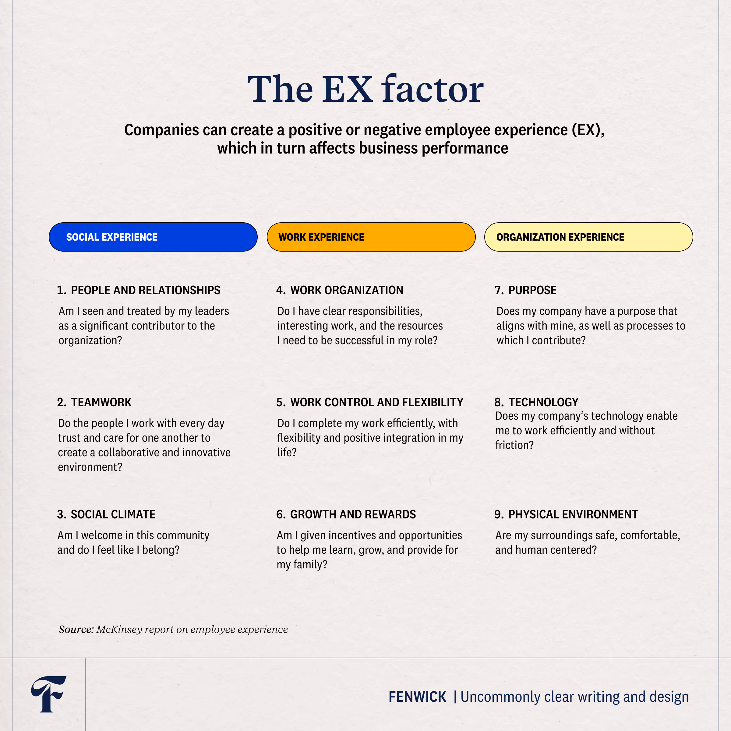 Organizations that design an employee experience model that optimizes all nine of these areas have the highest chance to attract, inspire, and retain the best talent. In fact, McKinsey research shows that employees at companies with high EX are more inclined to surpass work expectations, with a 40 percent higher level of effort towards discretionary work.